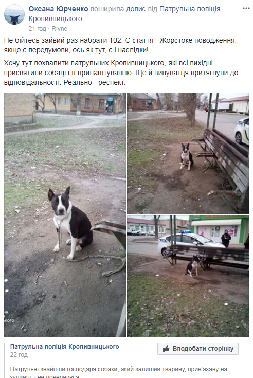 Згодом патрульні поліцейські знайшли навіть кропивничанина, який 2 роки тому віддав даного собаку на виховання чоловікові, якого розшукують. Останній вказав адресу, за якою мешкає господар собаки.