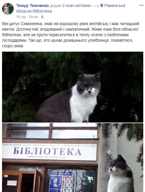 Перехожі часто бачать його біля приміщення обласної бібліотеки, що на вулиці Короленка, 6. Кіт з грайливим характером, доглянутий і цікавий до нового. Рівнянин Тимур Тимченко, жартівливо зауважує, що тваринка доволі інтелігентна і мови іноземні знає, вірші цитує. Тож пригляньтесь до цього котика, можливо вам не вистачає такої компанії.
