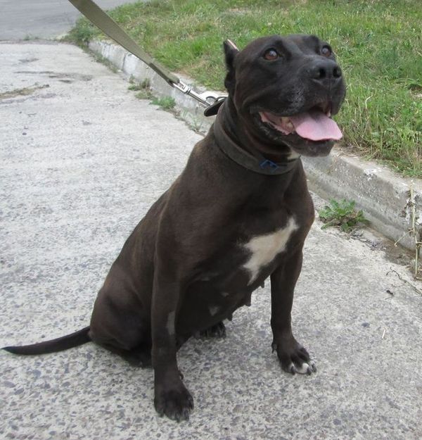 В четвер зателефонував чоловік і повідомив, що вже два дні поспіль бачить прив’язаного до дерева чорного ніби бульдога і попросив поїхати подивитися, що це за собака. Поїхали подивитися. Побачили стаффордширського терьєра – дівчинку, прив’язану до дерева залізним ланцюгом. Місце безлюдне (дорога до урочища Сосонки), на сонці, без їжі і води. Ще й в наморднику синтетичному була, але, видно, зняла, бо намордник валявся поруч. Отак сиділа щонайменше дві доби, очікуючи, коли господар прийде погодувати. Воду пила – не могла напитися.. Зраділа неймовірно, коли її відв’язали від дерева і повели на ланцюгу… Радісно бігла поряд, давала лапу… Ручна собака, домашня, на шиї два нашийники – чорний шкіряний і від бліх. Але доглянута погано, боки ввалилися. Хто міг таке зробити – лишити собаку повільно вмирати у спеку без води? Як рука піднялася ???